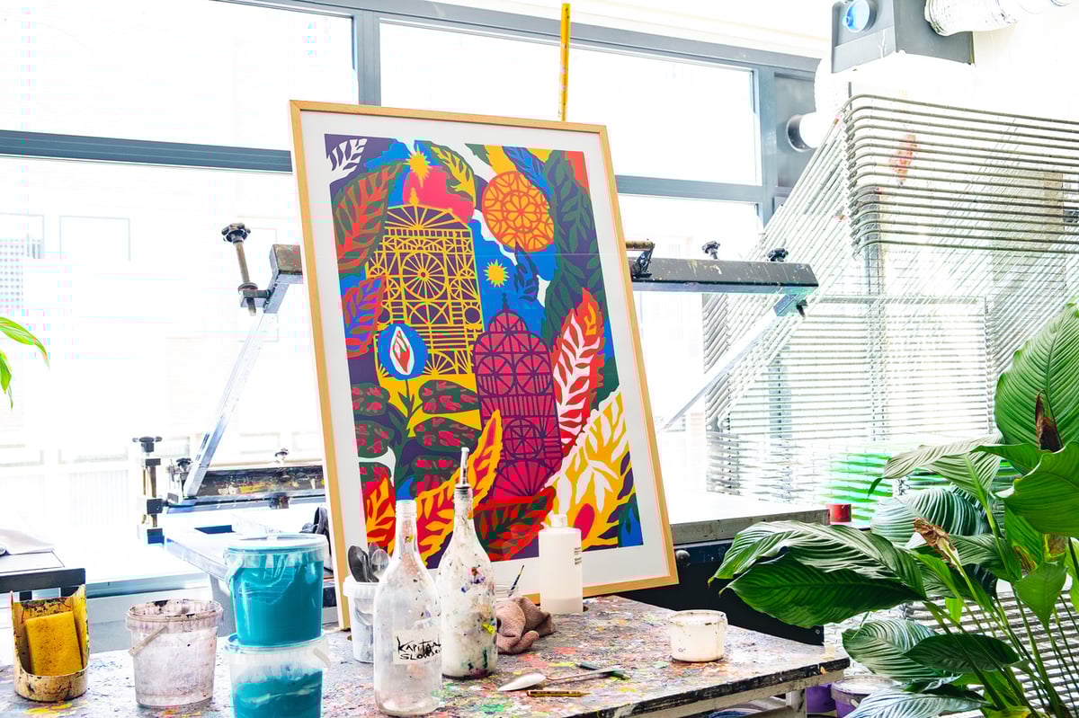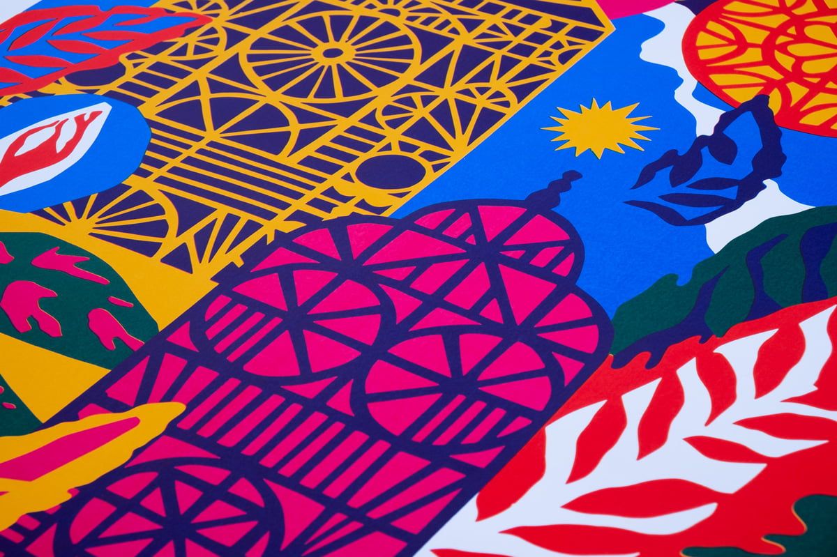 A 100 x 70 cm three colour screenprint in a limited edition of 12. Medieval windows and mathematical structures clashing with a swaying forest 🏰🌳 Creating a much needed colourful sanctuary out of the world for these new dark ages. Printed on 300 grs. Olin Rough high-white.
