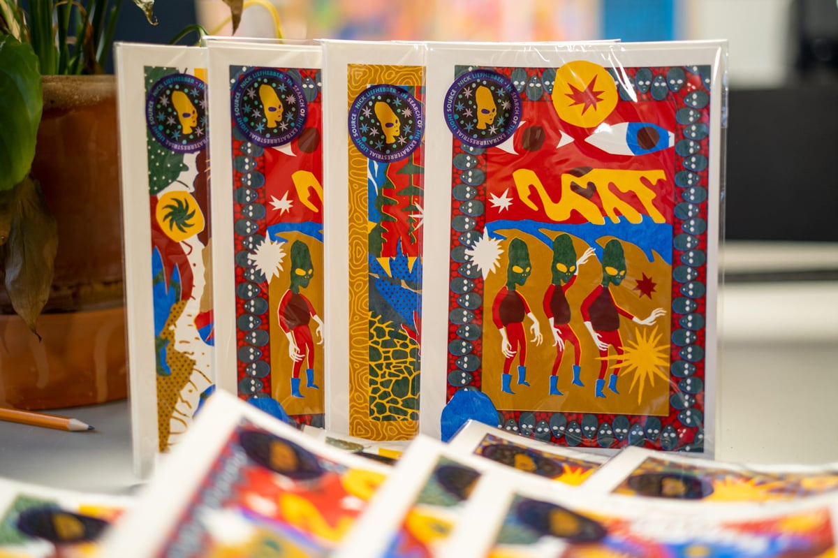 By the end of each year I always create a set of small screen prints, you can also call them Christmas cards. This year I wanted to do something special with the star theme, very christmassy. But what was the brightest star? Probably the meteorite wiping out almost all dinosaurs roughly 65 million years ago. I also threw some visitors from the stars in the mix. This is a set of 4 A5 sized screenprinted cards.